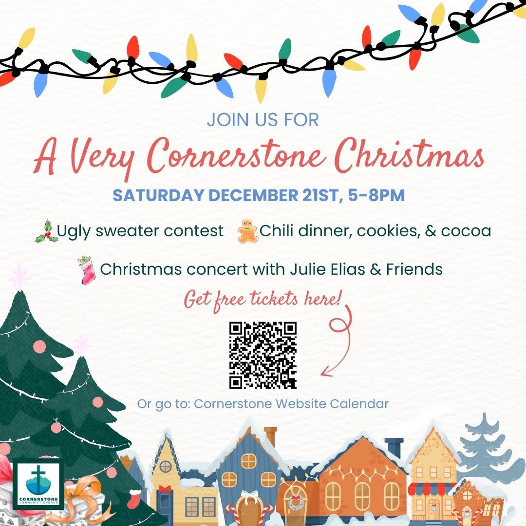 Join us for a night of festive family fun including: Ugly Christmas Sweater Contest (with prizes!), chili dinner, cookies, hot cocoa, & Christmas concert with Julie Elias & friends. Reserve your FREE tickets!Images