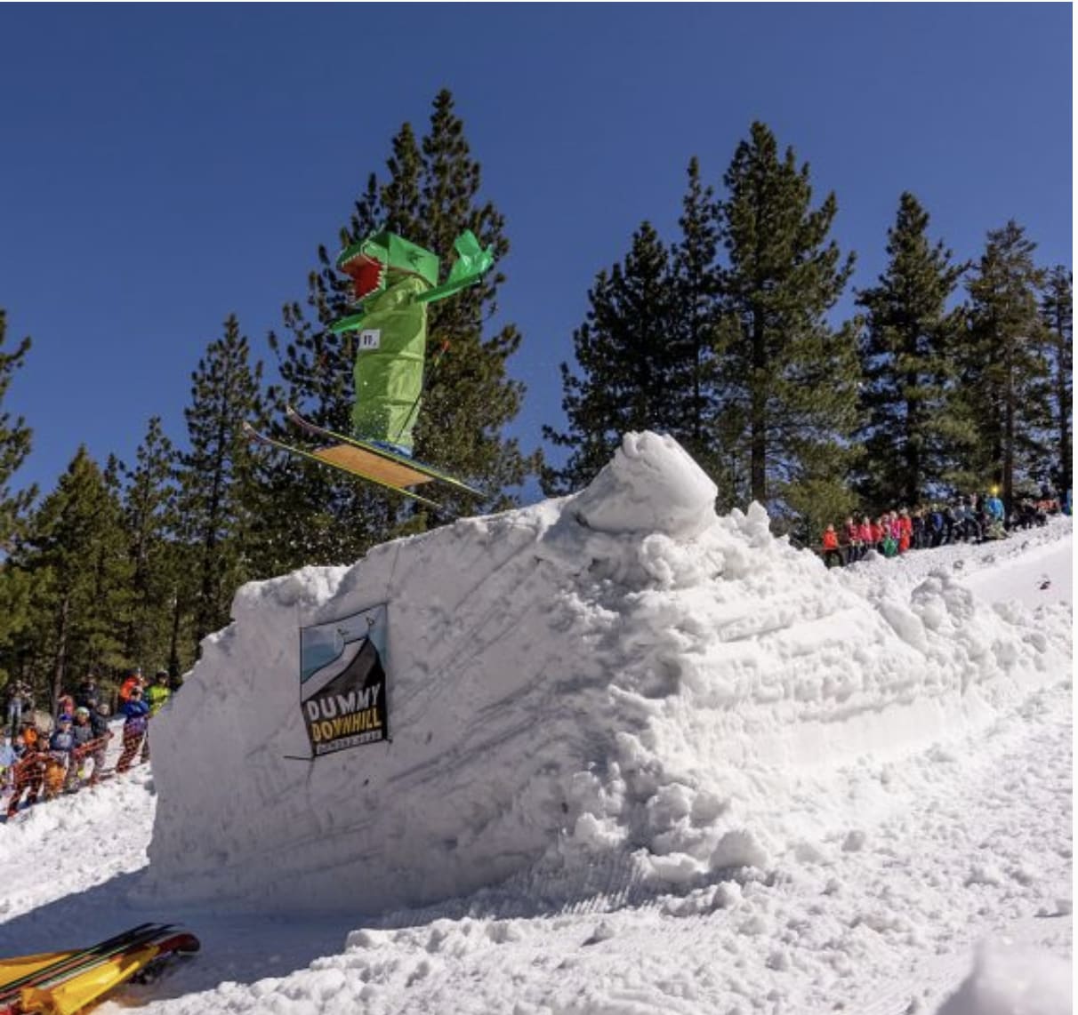 Join us for the 22nd annual Dummy Downhill on Saturday, April 13, 2024. Participants build a dummy on skis or snowboards that gets launched off of a big jump, while spectators get to watch as unique characters fly down the hill or crash hard. This is Diamond Peak’s signature spring event and the biggest party of the year. Even non-skiers will want to come watch the madness! A panel of celebrity judges will evaluate all Dummies on the snow by the Base Lodge, followed by the dummy launch and an awards ceremony. Prizes and certificates are awarded for creativity, best crash, furthest distance, and more.