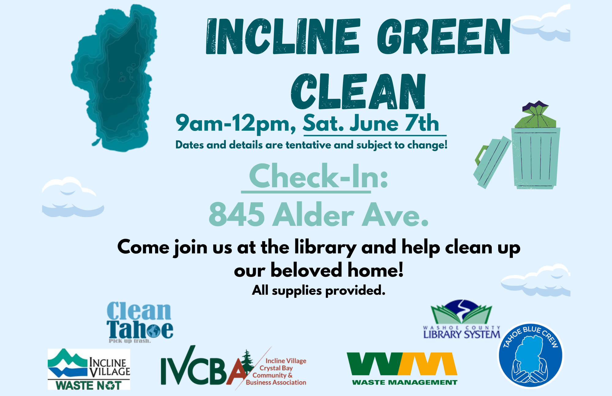 Join your neighbors for Incline Green Clean on Saturday, June 7th from 9am–12pm! Meet at 845 Alder Ave (Incline Village Library) to check in and help tidy up our beautiful community. All cleanup supplies will be provided—just bring your enthusiasm and love for the Lake!