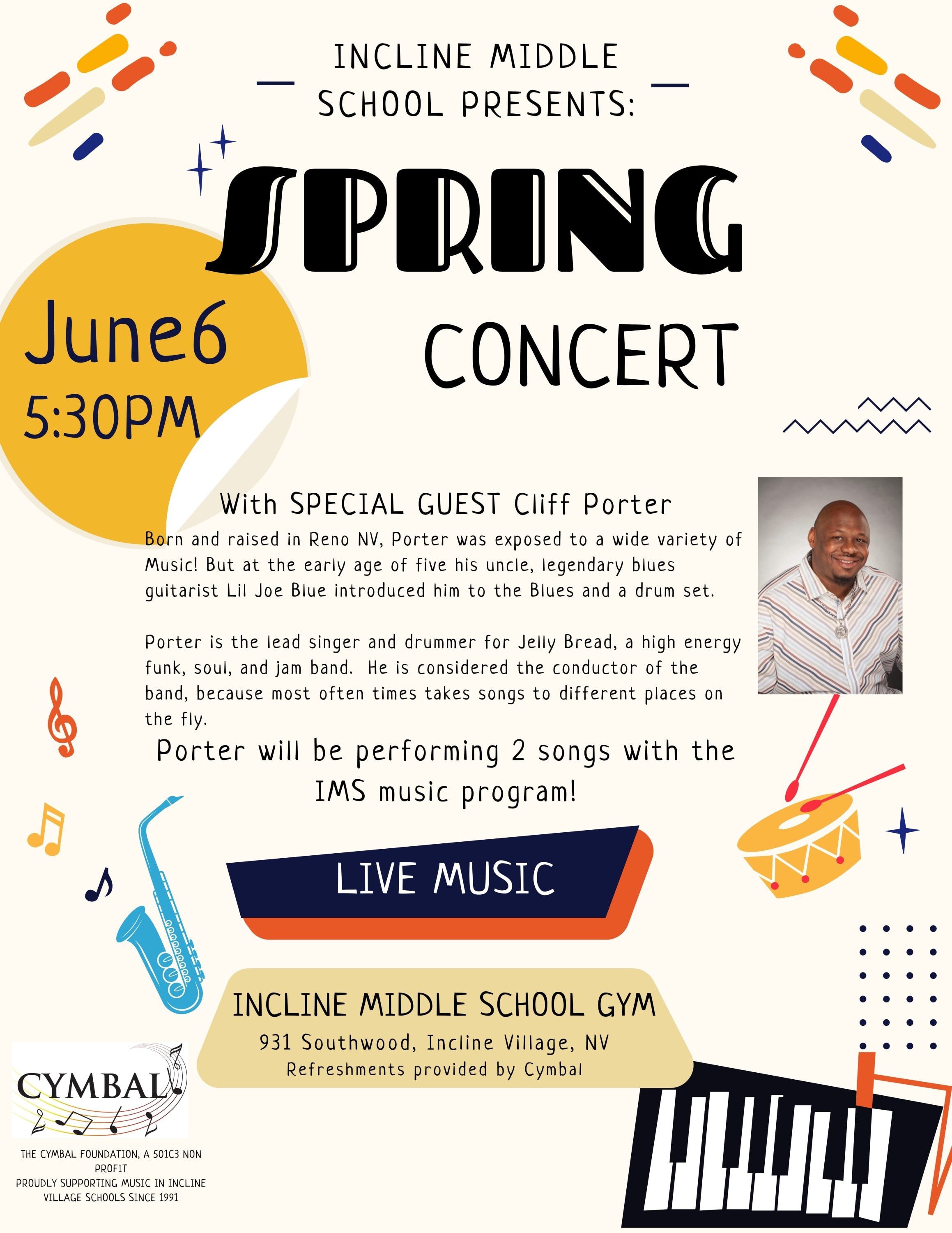 With SPECIAL GUEST Cliff Porter Born and raised in Reno NV, Porter was exposed to a wide variety of Music! But at the early age of five his uncle, legendary blues guitarist Lil Joe Blue introduced him to the Blues and a drum set. Porter is the lead singer and drummer for Jelly Bread, a high energy funk, soul, and jam band. He is considered the conductor of the band, because most often times takes songs to different places on the fly. Porter will be performing 2 songs with the IMS music program!