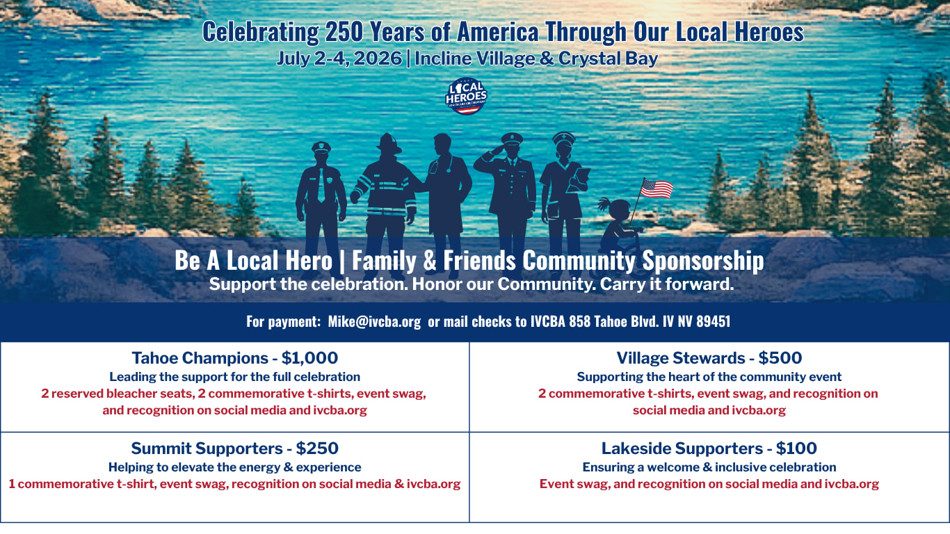 Want to be part of something bigger this Fourth of July? The Be a Local Hero Family & Friends Community Sponsorship is your chance to stand behind the veterans, first responders, educators, and neighbors who make Incline Village and Crystal Bay extraordinary. Sponsorships start at just $100 — and every level comes with recognition, swag, and the satisfaction of helping our community celebrate 250 years of American spirit.