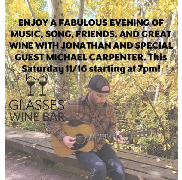 Live Music with Jonathan Hennion - Great Vibe & Fun Time Incredible Local Musicians Wonderful Wine Sounds like you need to be at Glasses Wine Bar Saturday, 11/16, starting at 7:00 pm.