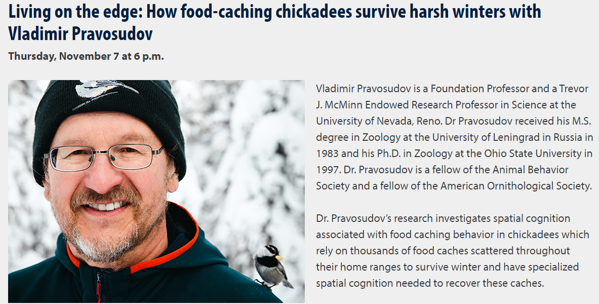 Dr. Pravosudov's research investigates spatial cognition associated with food caching behavior in chickadees which rely on thousands of food caches scattered throughout their home ranges to survive winter and have specialized spatial cognition needed to recover these caches.