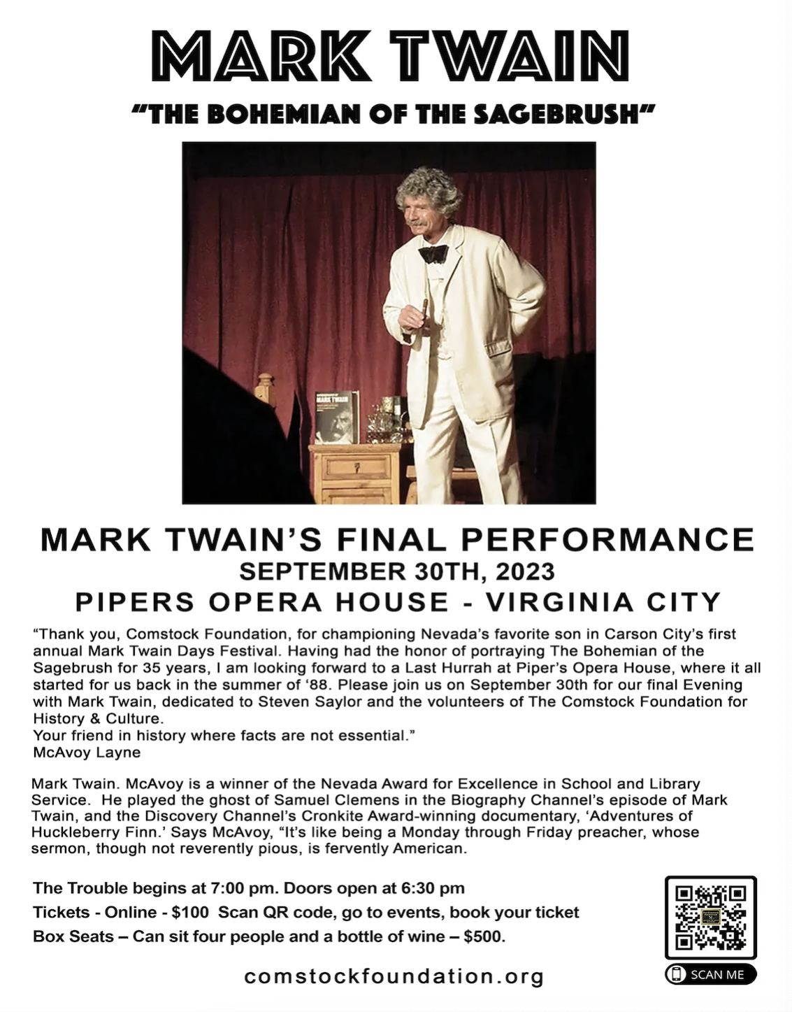 Mark Twain's final performance - September 30th, 2023 - Pipers Opera House - Virginia City