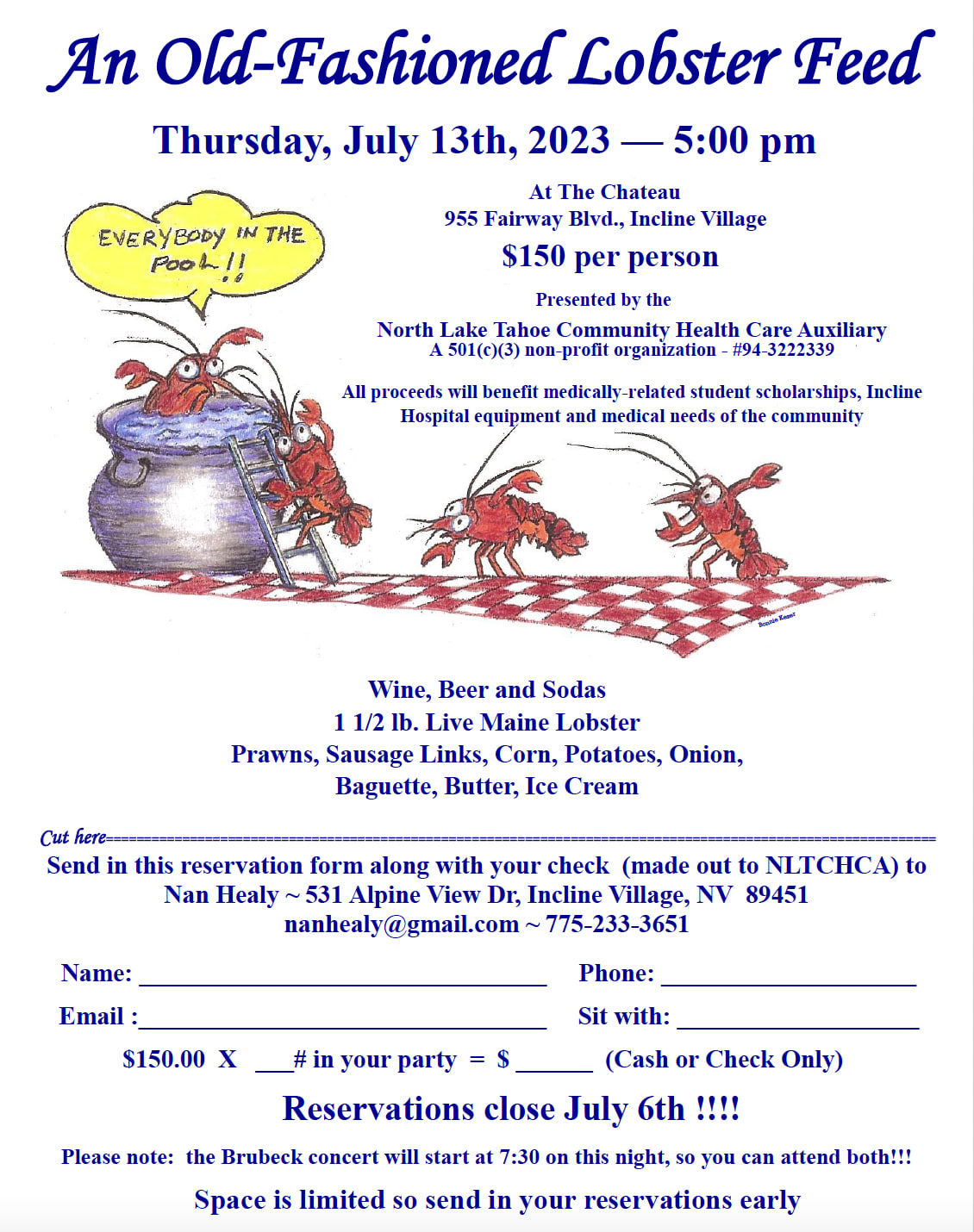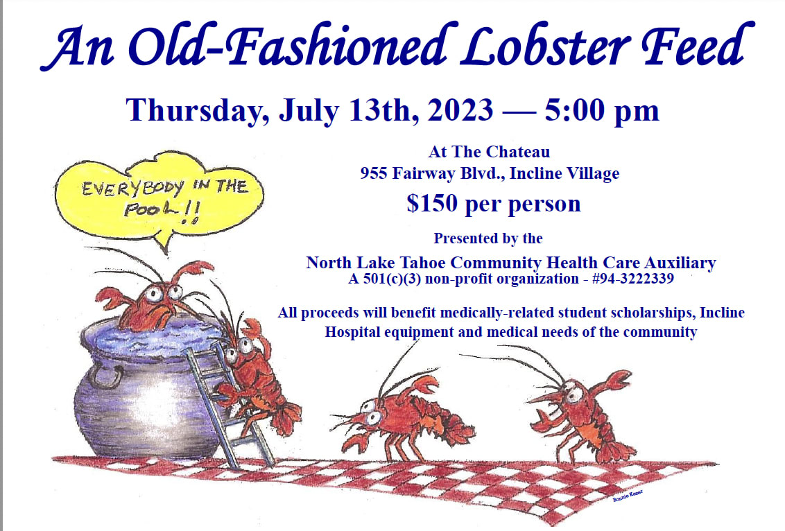 North Lake Tahoe Community Health Care Auxiliary Lobster Feed is July 13th. Registration closes July 6th!