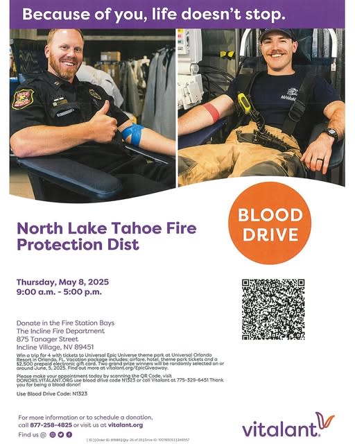 To make a donation appointment please scan the QR code, or call 775-329-6451 or visit DONORS.VITALENT.ORG and use blood drive code N1323.
