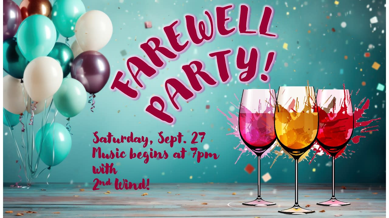 After 8yrs 9mos, It's time for Kathleen & Rob to pass the wine glass to great new owners! We're celebrating with the fabulous duo 2nd Wind. Great music all night, give-aways, fun, (and probably a few tears) Join us in saying "It's been WONDERFUL!"