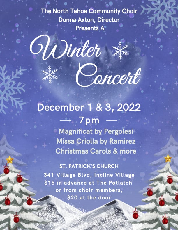 he North Tahoe Community Choir Donna Axton, Director North Tahoe Community Choir, Donna Axton, Directo December 1 & 3, 2022 7PM Magnificat by Pergolesi Missa Criolla by Ramirez Christmas Carols & more ST. PATRICK'S CHURCH 341 Village Blvd, Incline Village $15 in advance at The Potlatch or from choir members, $20 at the doorImages