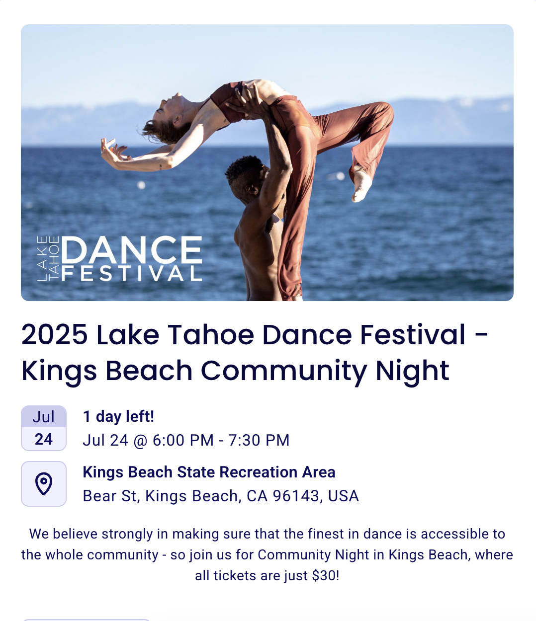 We believe strongly in making sure that the finest in dance is accessible to the whole community - so join us for Community Night in Kings Beach, where all tickets are just $30!