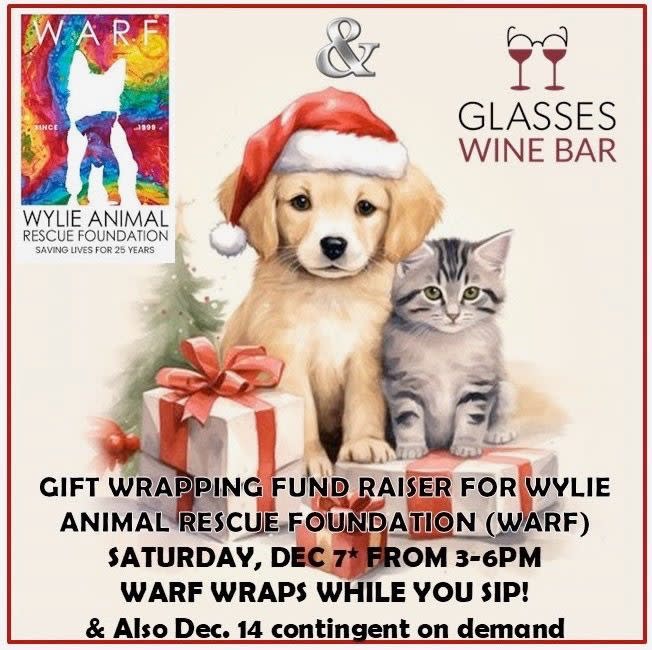 Need help wrapping your holiday gifts? WARF will be wrapping gifts for you at Glasses Wine Bar on Saturday, December 7th from 3-6pm. We will also have some great silent auction items to bid on that are perfect holiday gifts! Come on out and sip wonderful wine and support WARF.