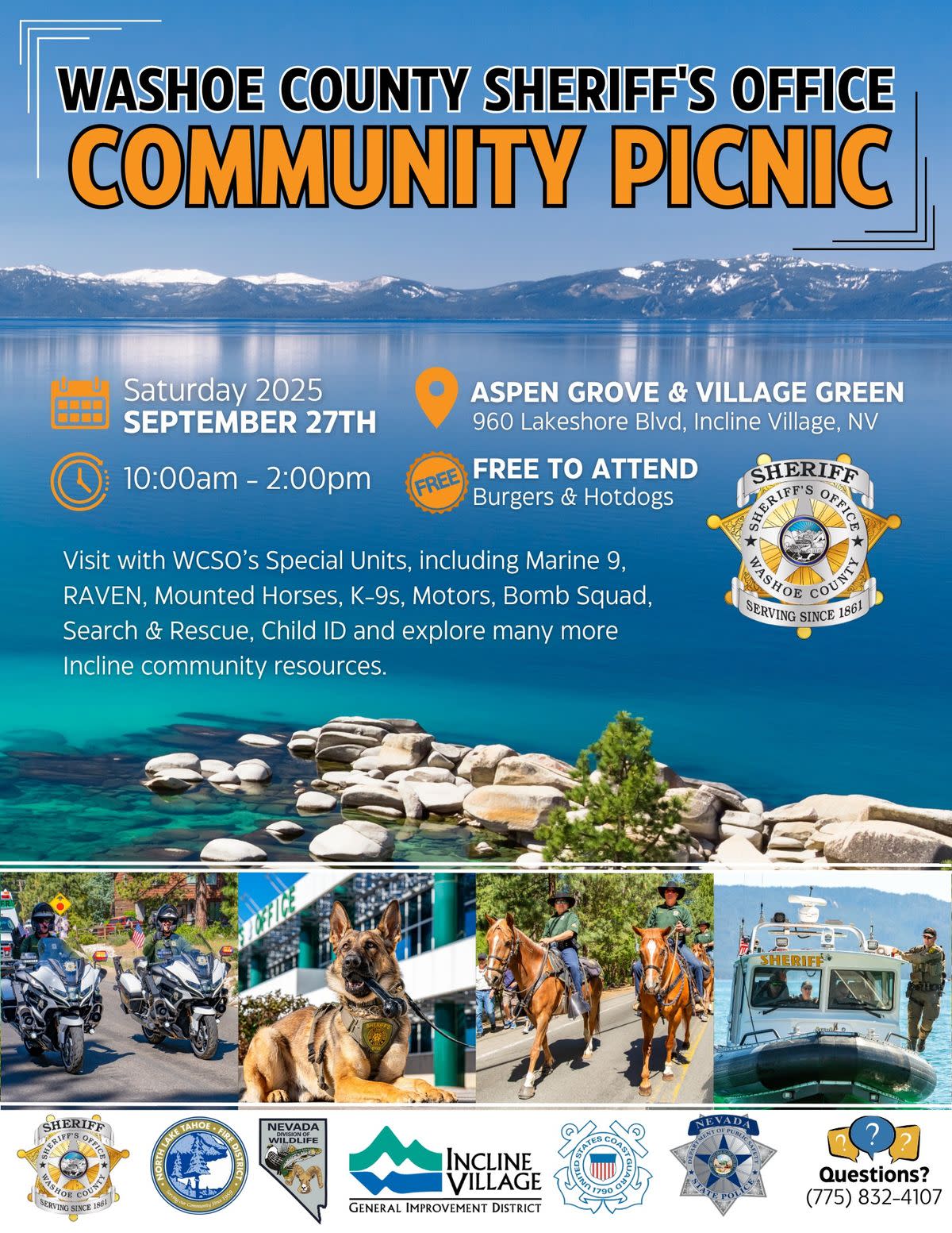 The Washoe County Sheriff’s Office is excited to welcome community members to our annual Incline Community Picnic on Saturday, September 27, 2025, from 10:00 a.m. to 2:00 p.m. at Aspen Grove & Village Green in Incline Village.