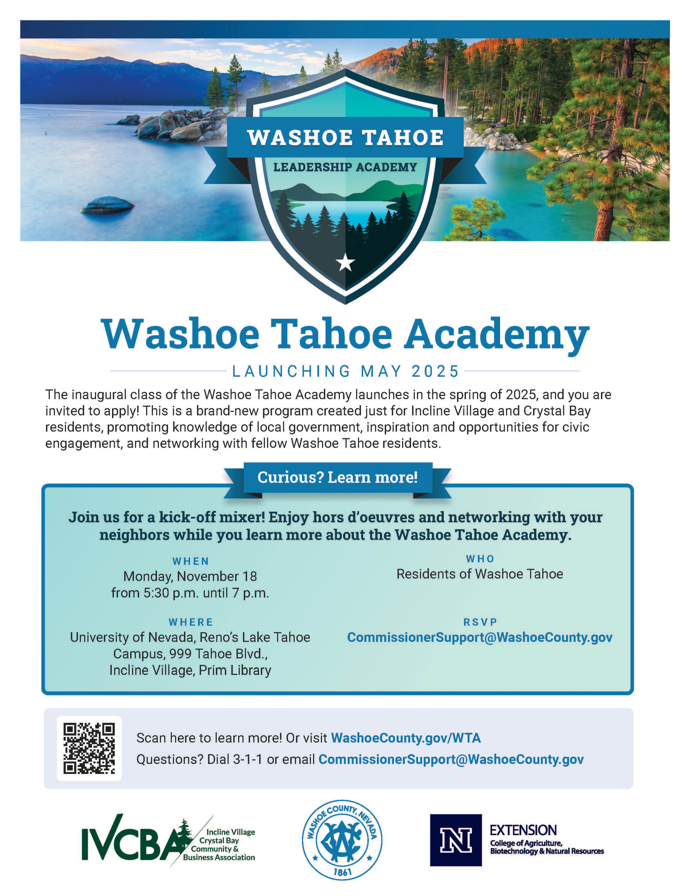 The inaugural class of the Washoe Tahoe Academy launches in the spring of 2025, and you are invited to apply! This is a brand-new program created just for Incline Village and Crystal Bay residents, promoting knowledge of local government, inspiration and opportunities for civic engagement, and networking with fellow Washoe Tahoe residents. Presented by Washoe County, UNR, and IVCBA.